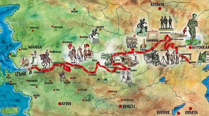 Çok muzır biriyim… Rahat batıyor sanki… Durup duruken şu rotaları da araya serpiştireyim bari demedim mi? El, insaf. Ama hayır… Şimdi dördüncü ve son “YOL” masalına geçmeden önce şöyle bir Ege’ye uzanmadan olur mu? Yakından bakınca ne yapmaya çalıştığımın farkına varabilirsin. Evet. Basbayağı bir “Kurtuluş Savaşı”nın rotasını çizmiş bulunuyorum. Öyleyse “Zafer Yolu”nun devamı olan bu alt safhaya geçebilirim: “Özgür İZMİR”…